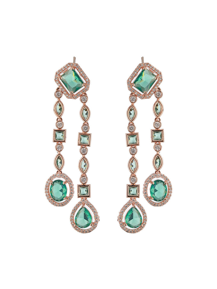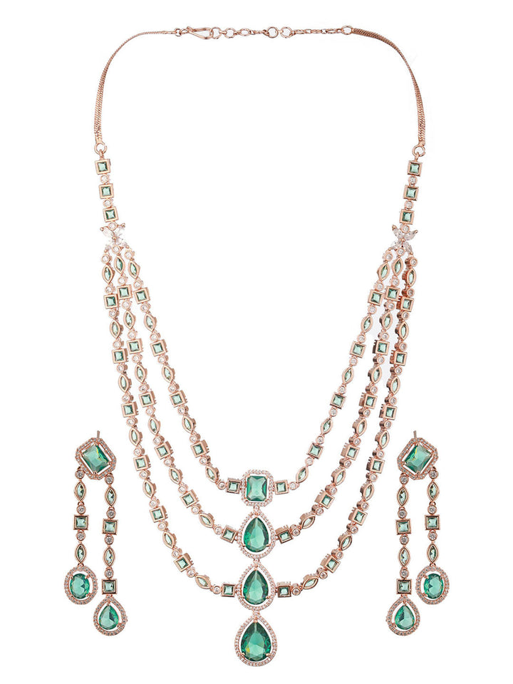 Rose Gold Plated Green American Diamond Studded and Beaded Layered Jewellery Set